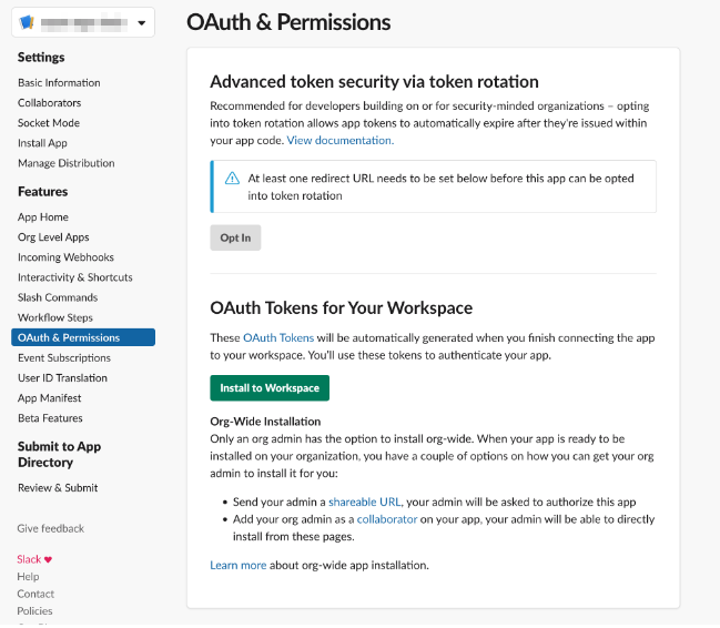 먼저, 슬랙 서비스 설정은 다음과 같습니다.
