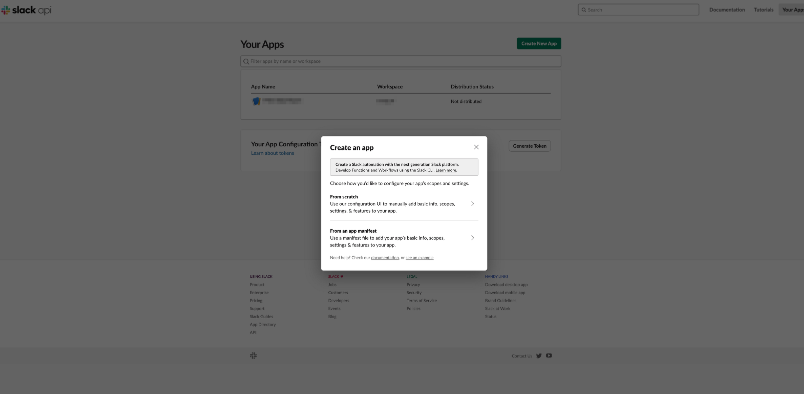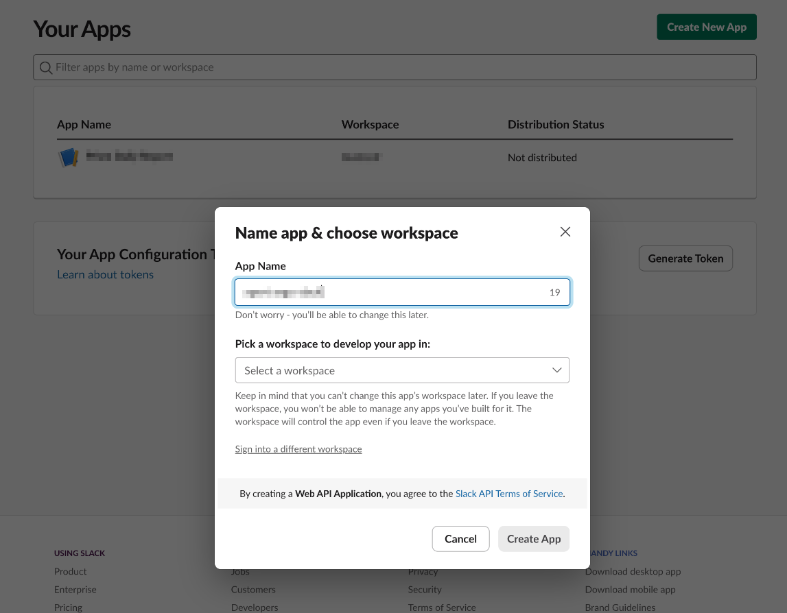 application의 이름을 설정하고, 설치할 슬랙의 workspace을 선택한 다음, Create App을 누릅니다.
