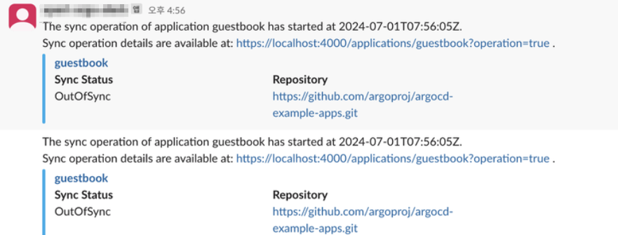 kubectl exec -it argocd-notifications-controller-1234a567b8-cd90e -- /app/argocd-notifications template notify app-sync-failed guestbook --recipient slack:<슬랙 채널명>