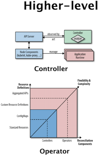오퍼레이터는 CustomResourceDefinition을 사용하여 특정 애플리케이션의 운영 지식을 알고리즘적이고자동화된 형태로 캡슐화하는 컨트롤러입니다. 오퍼레이터 패턴은 우리가 컨트롤러 패턴을 확장하여 더 많은 융통성과 더 대단한 표현을 가능하게끔 합니다.