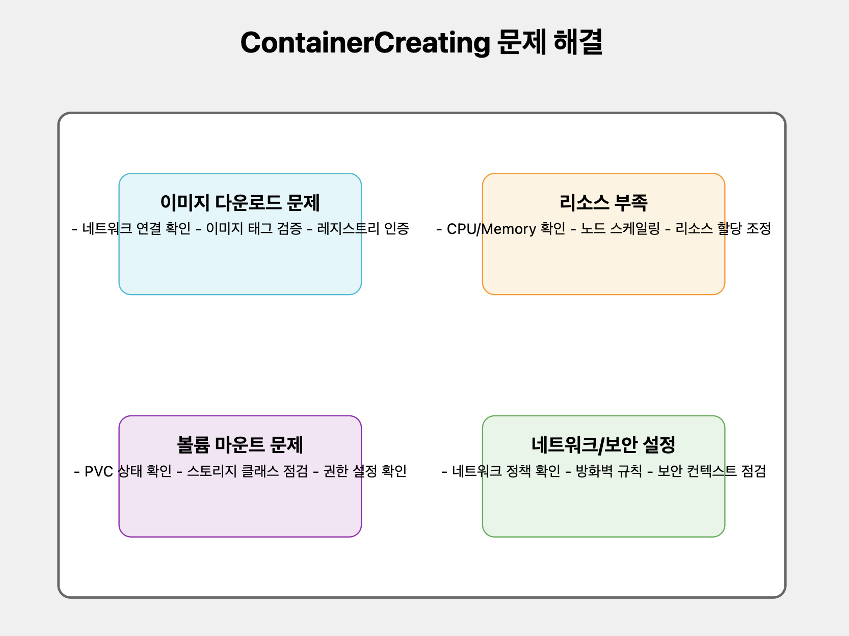 ContainerCreating 상태는 단순한 대기 상태가 아니라, Kubernetes의 복잡한 컨테이너 오케스트레이션 프로세스를 보여주는 창구입니다.