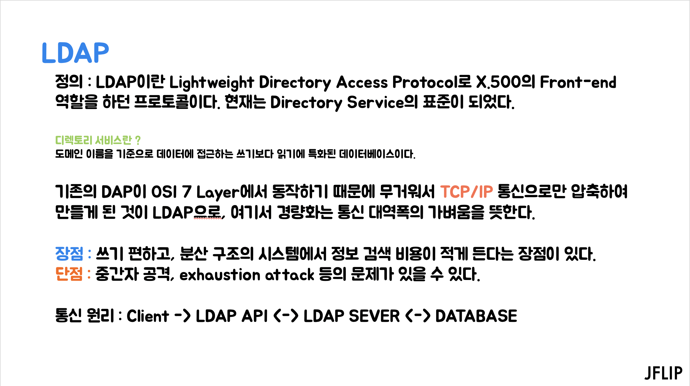정의 : LDAP이란 Lightweight Directory Access Protocol로X.500의 Front-end 역할을 하던 프로토콜입니다.