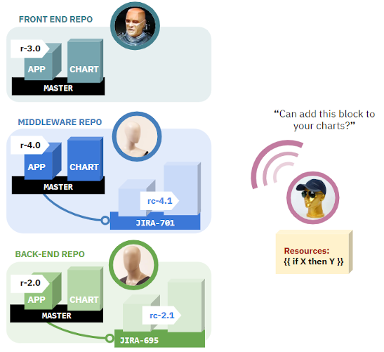 만약에 이를 헬름 차트 유지와 인프라스트럭처 구성을 위해서 실전에 적용하려 한다면, 애플리케이션 개발자들의 손에 많은 책임을 쥐게 할 것입니다. 그들은 “배포자”의 역할을 맡아 그들의 레파지토리에 있는 구성을 바꿀 것입니다.