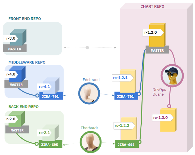 · 개발자들(Edeltraud and Eberhardt – 한국명 철수와 훈이)이 동시에 다른 특징을 가진 브랜치에서 작업을 하고 있고, Dev 환경에서 차트 변화를 테스트하고 싶어 합니다. 그래서 차트를 분기할 필요가 있습니다.
