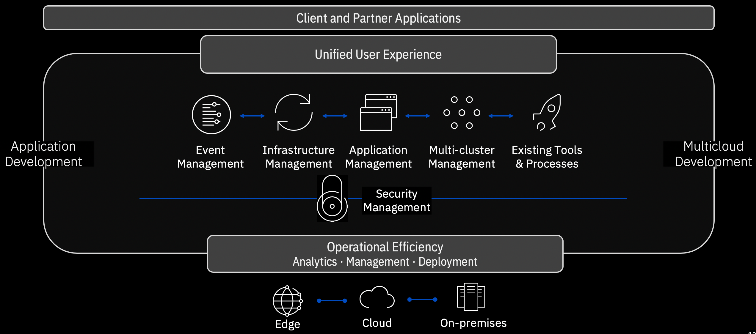 The IBM Cloud Pak™ for Multicloud Management, running on Red Hat® OpenShift®, provides consistent visibility, governance and automation from on premises to the edge. Enterprises gain capabilities such as multicluster management, event management, appli