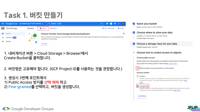 이번 랩에서는 Cloud Storage를 통해 버킷 생성 / 파일 업로드 / 객체 액세스 권한 제어 등을 확인해 보겠습니다.