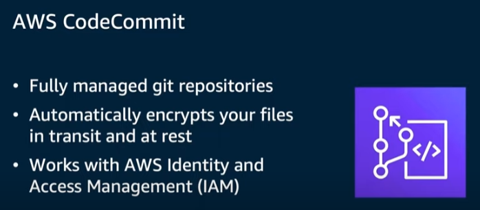 - CodeCommit은 완전 관리형 git 리포지토리입니다.