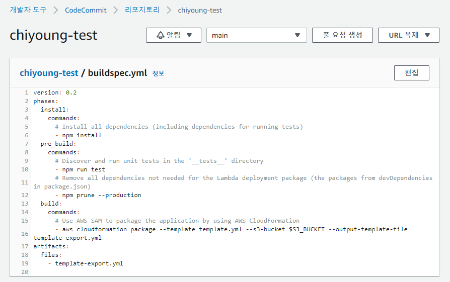 먼저, CodeCommit의 코드 브라우저에서 buildspec.yaml 파일을 확인해 봅시다.