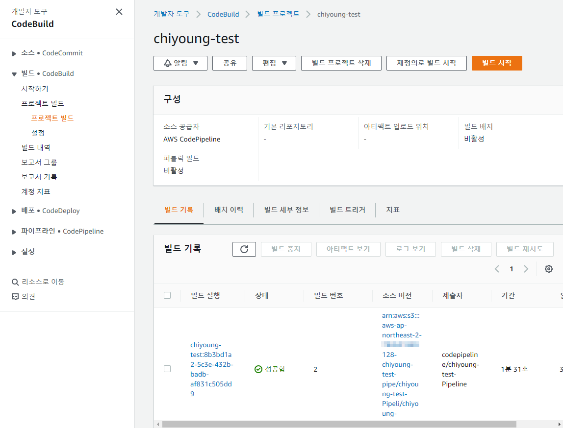 그리고 CodeBuild에서 프로젝트 빌드로 넘어가서 이전에 만든 빌드를 확인해 봅시다.