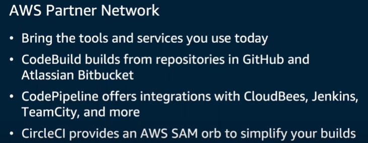 CodePipeline은 CloudBees, Jenkins, TeamCity 등과의 통합이 가능케 해 줍니다.