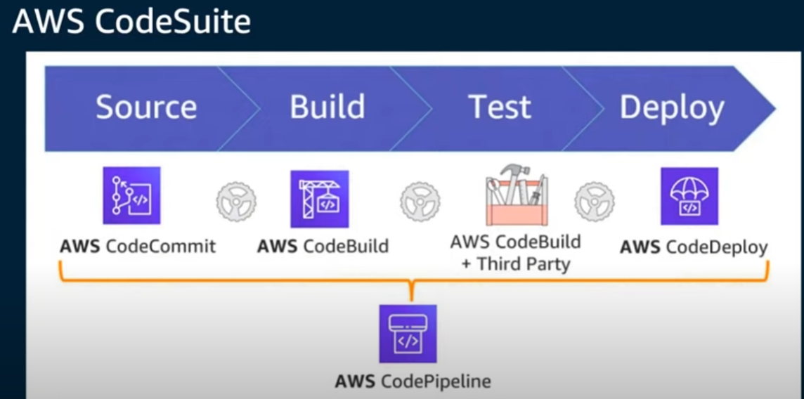 CodeCommit을 통해서 소스 코드를 저장하고, CodeBuild를 통해서 코드를 빌드하거나 혹은 서드 파티 애플리케이션을 통해서 빌드할 수 있습니다. 프로덕션 레벨로 코드를 배포합니다.