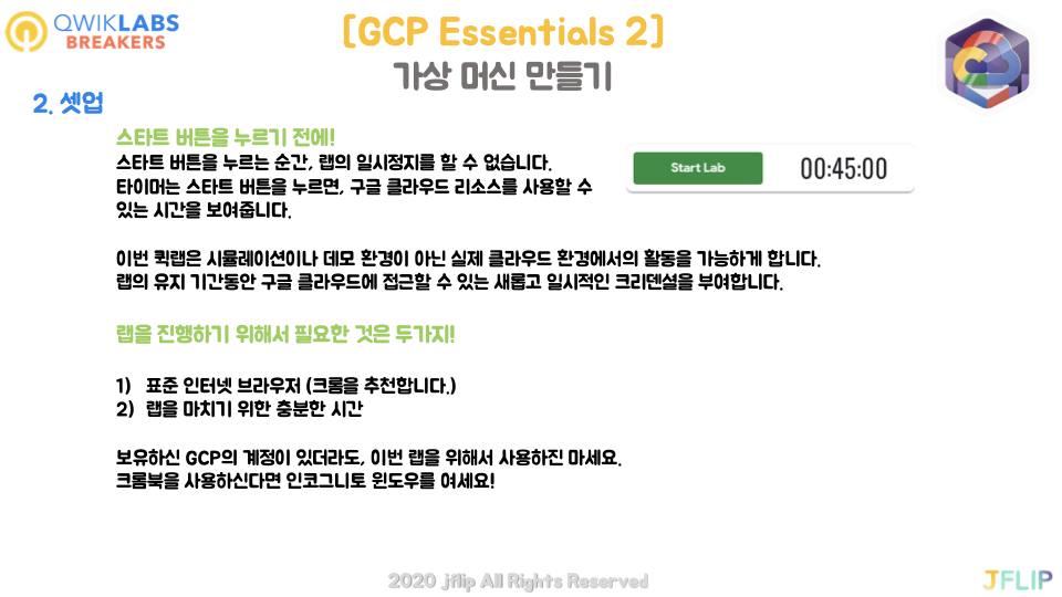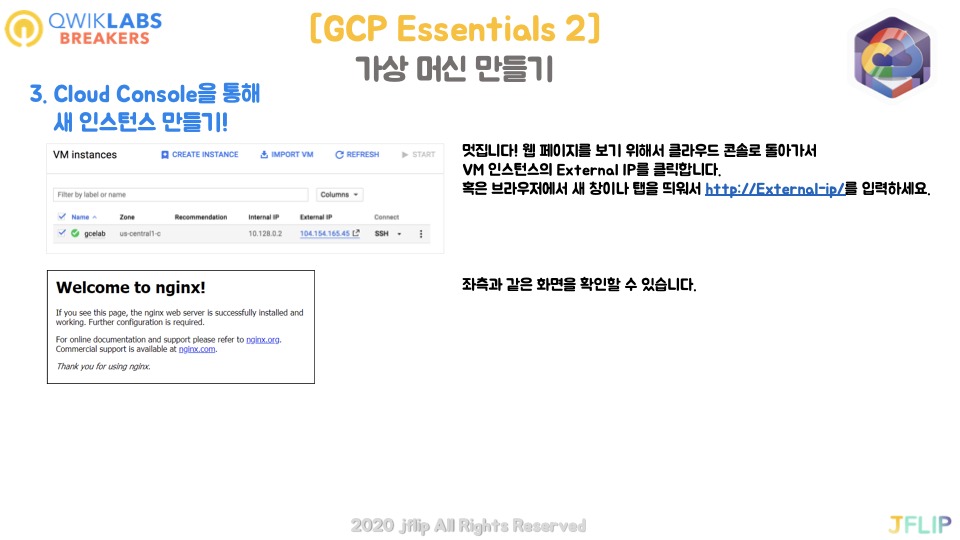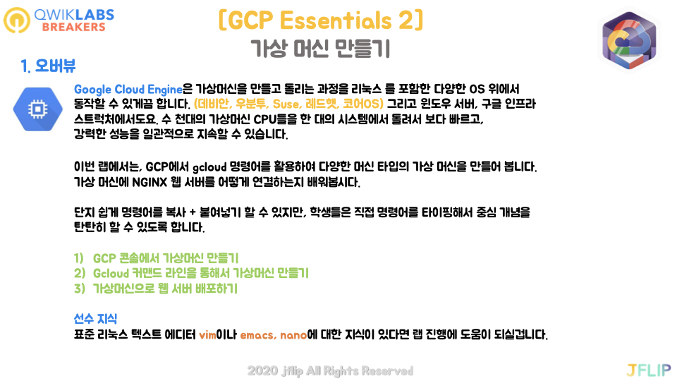 이번 GCE의 기본 랩을 통해서 앞으로는 서버 인프라, 로드 밸런서, 네트워크 토폴로지 설정하는 방법도 배울 수 있습니다.