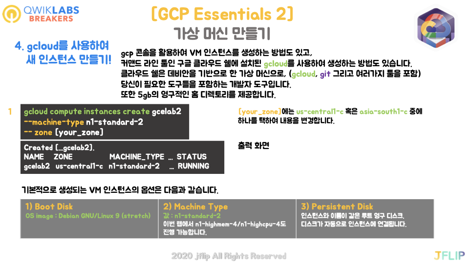 해당 명령어를 통해 생성될 VM 인스턴스의 기본 옵션은 위의 표와 같습니다.