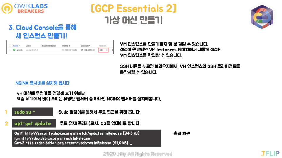 이번 랩에서는 GCE(Google Cloud Engine)을 활용해 가상 머신을 만들어 보았습니다.