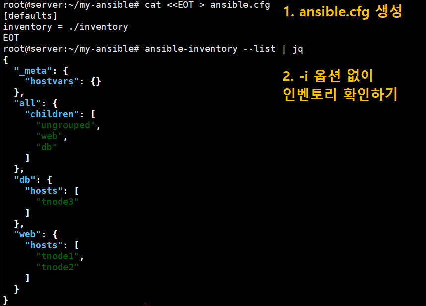 또한 기본 구성 파일인 ansible.cfg이 세팅되어 있을 경우, -i를 사용하지 않고도 해당 파일에 정의된 인벤토리의 호스트 정보를 확인할 수 있습니다.