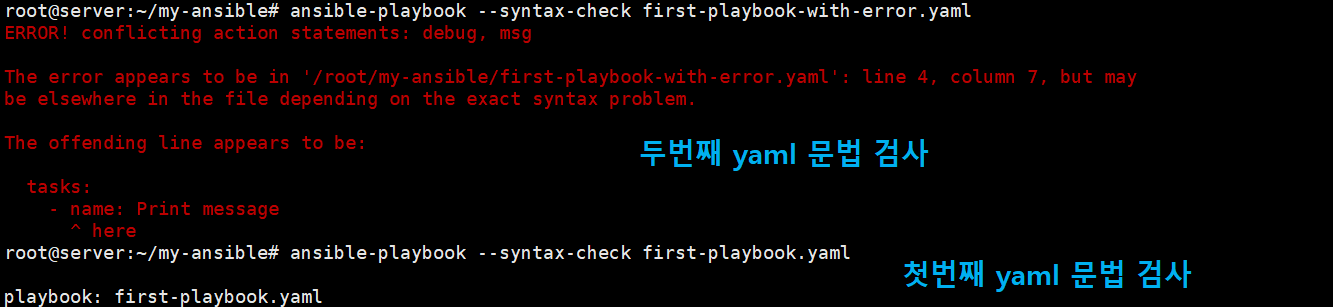 ansible에서는 문법 체크 기능도 제공하고 있는데요, 다음의 명령어를 수행하여 문법 체크 역시 가능합니다.