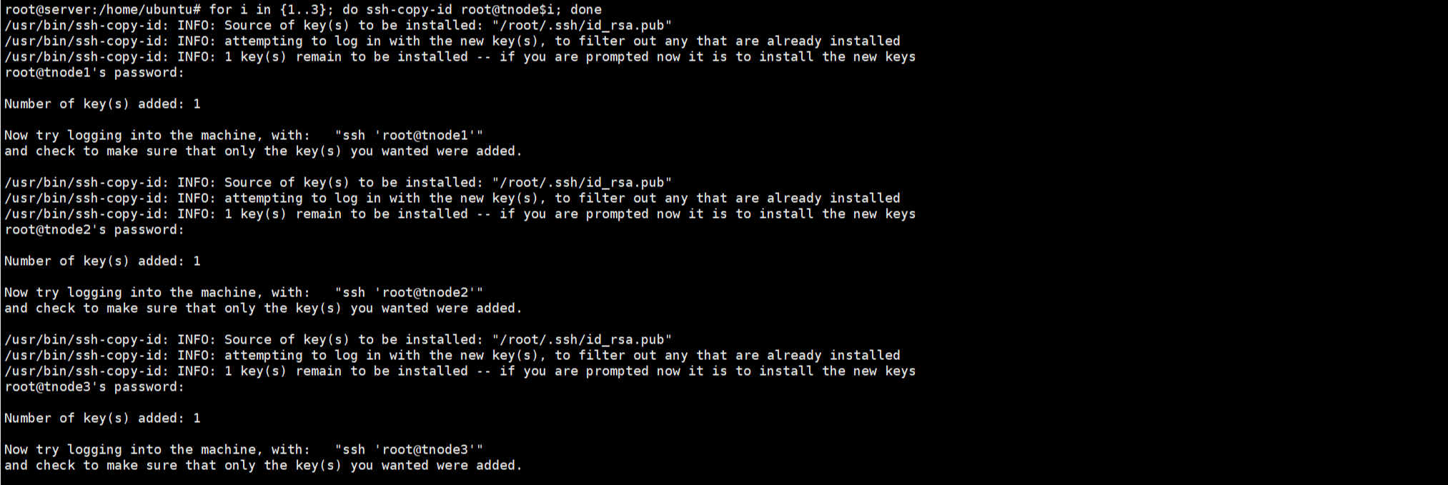 for i in {1..3}; do ssh-copy-id root@tnode$i; done