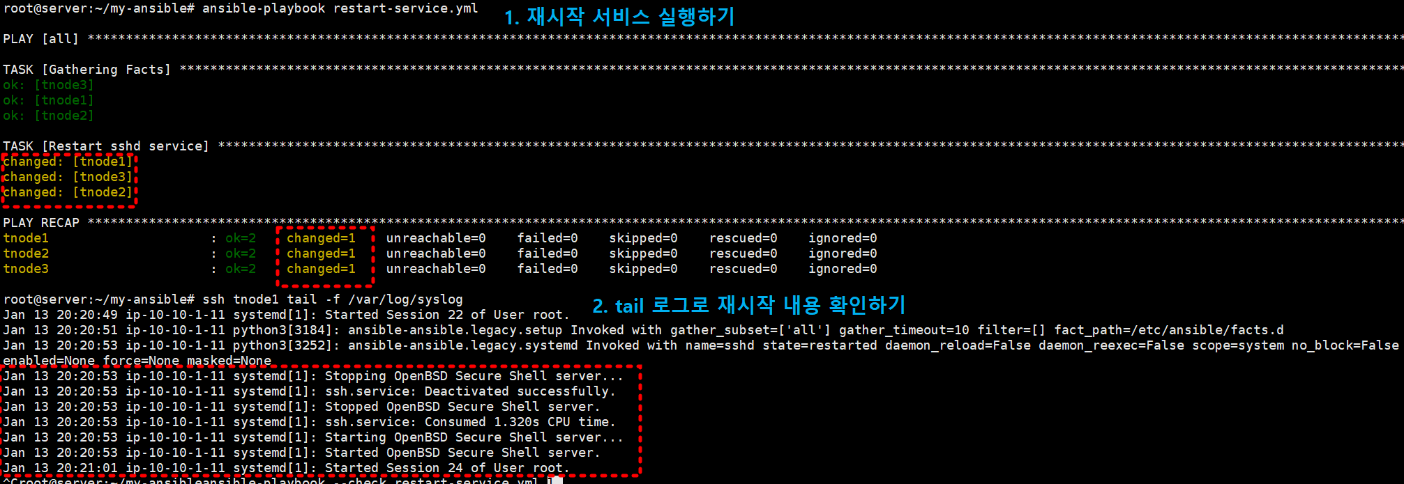 위와 같이 재시작 플레이북을 만들고, 실행하면 위와 다르게 TASK에 changed가 표기됩니다.