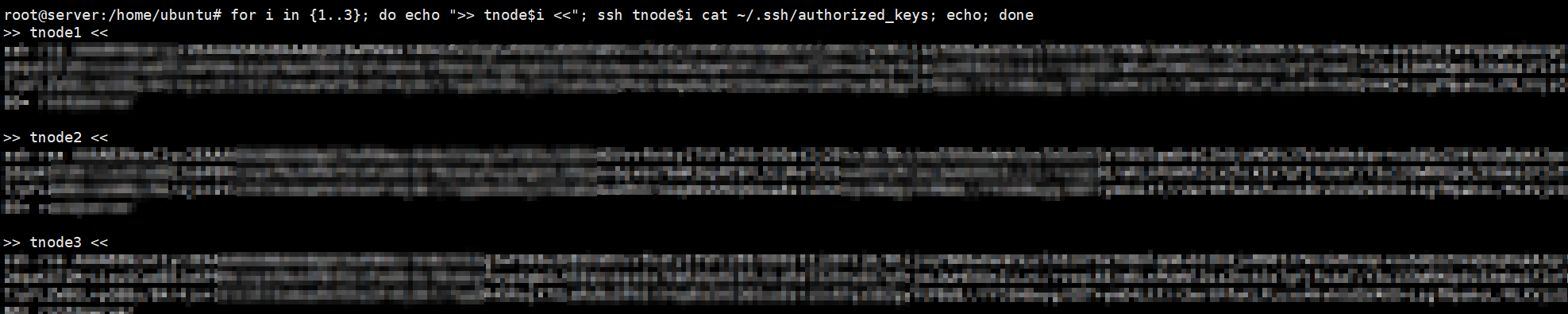 for i in {1..3}; do echo ">> tnode$i <<"; ssh tnode$i cat ~/.ssh/authorized_keys; echo; done