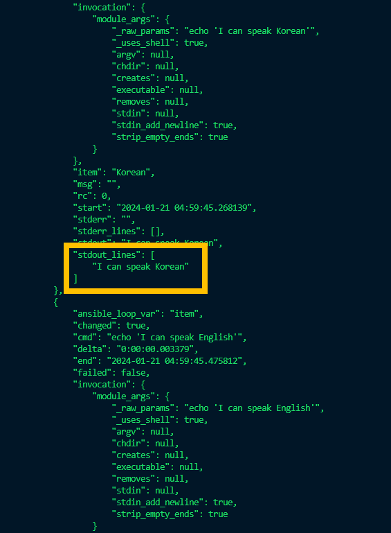 해당 아이템의 stdout의 값을 출력할 때는 item.stdout이라는 변수로 결과값을 출력합니다.